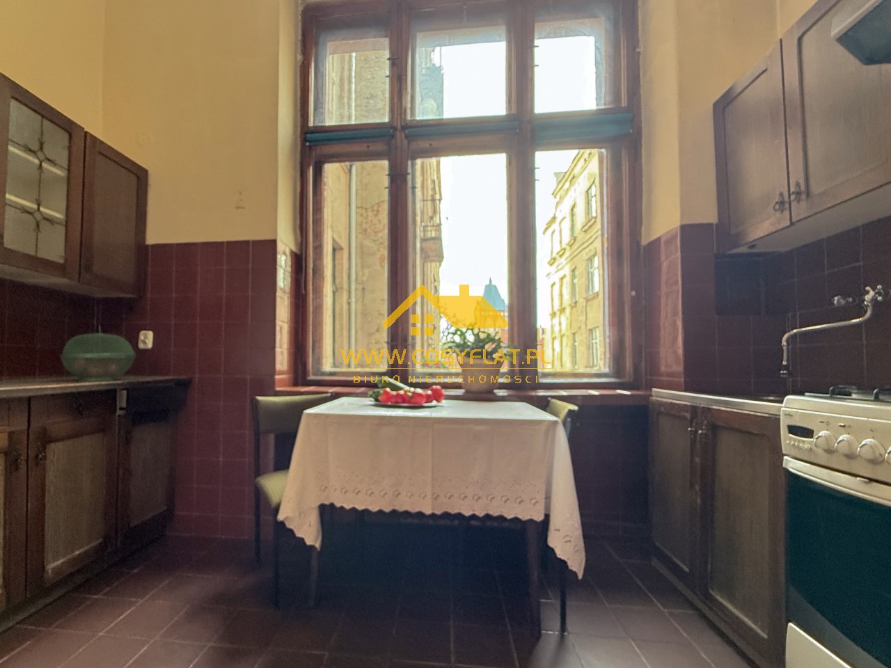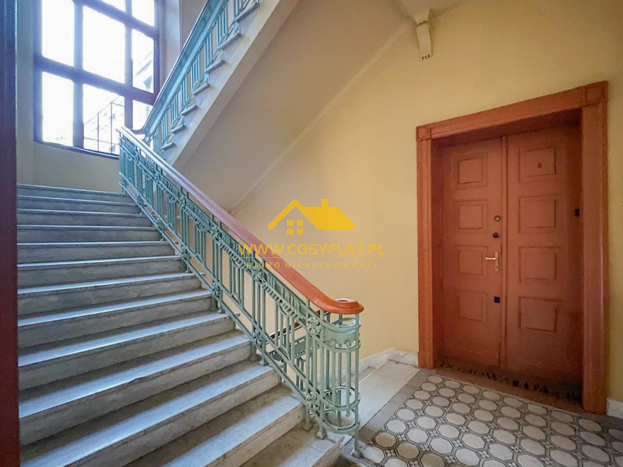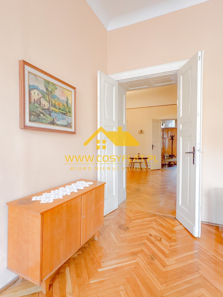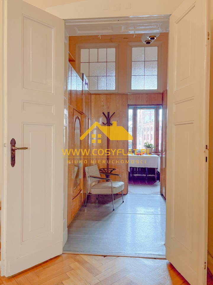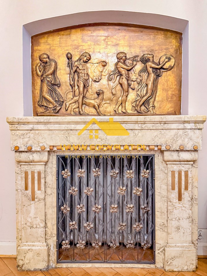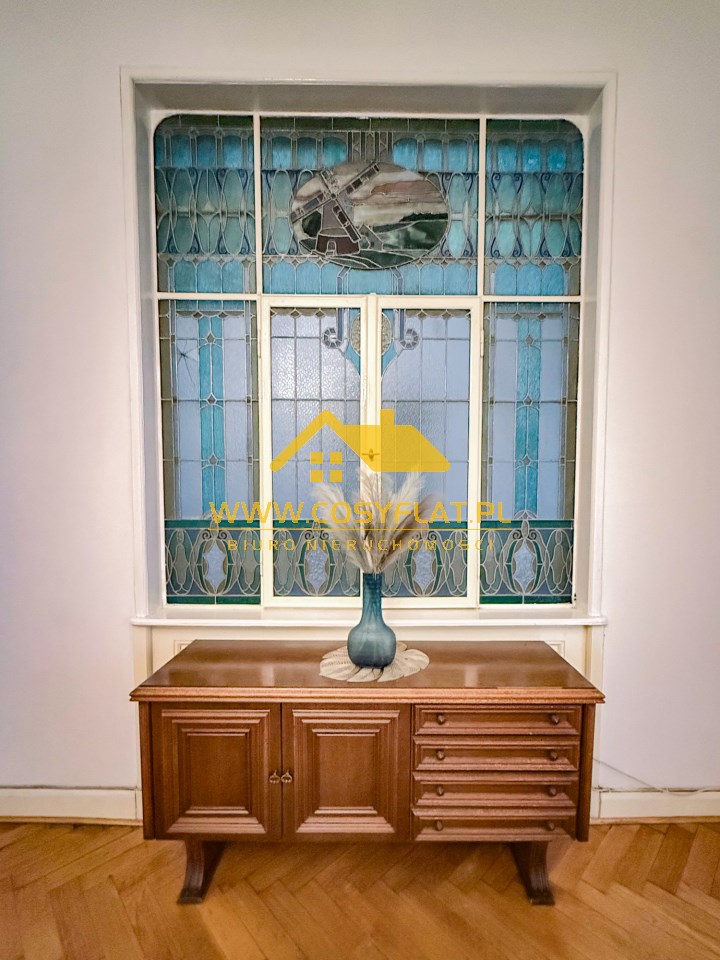 Prezentowana nieruchomość ma metraż 109 m2, na które składają się trzy pokoje -jeden z pięknym witrażem- wychodzącym na świetlik -oraz kominkiem. Kuchnię oraz łazienkę. Wysokość pomieszczeń to aż 340 cm.