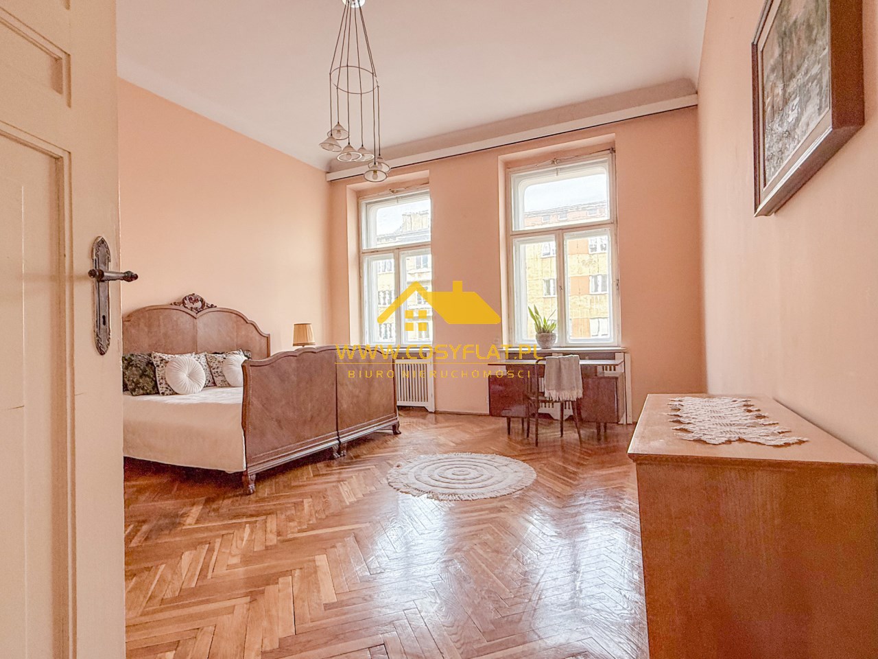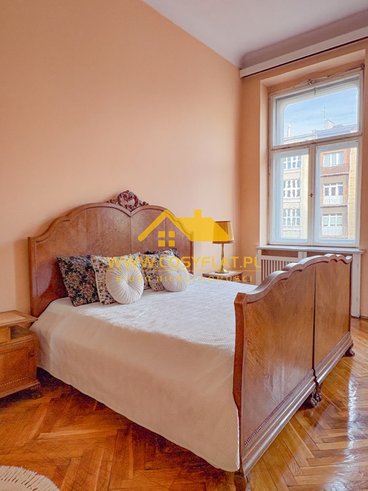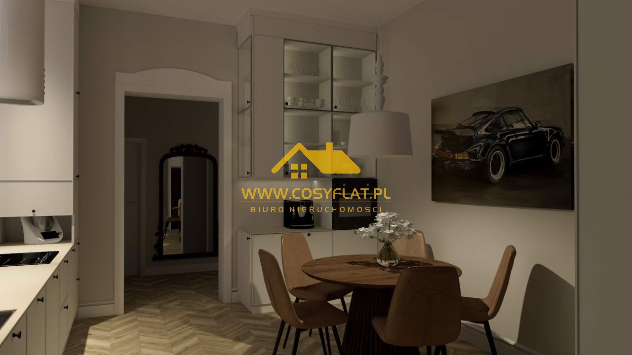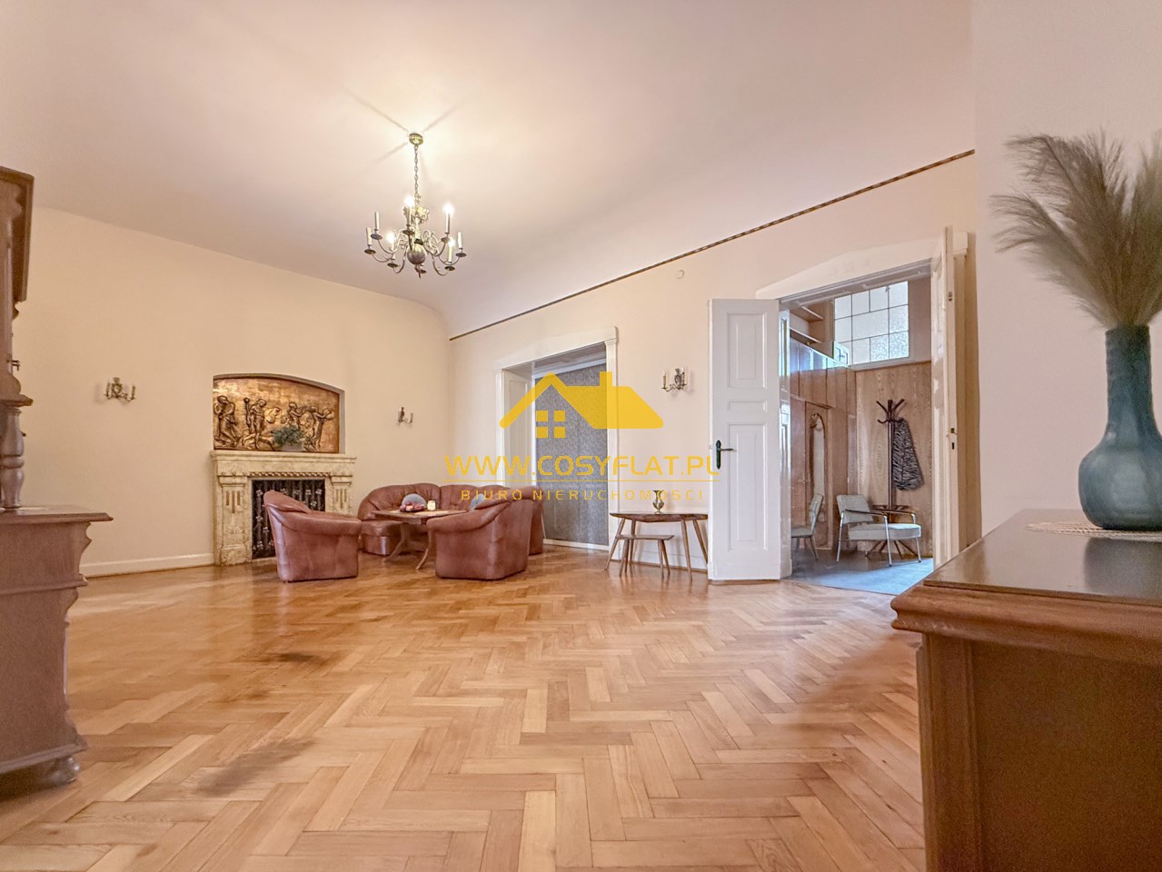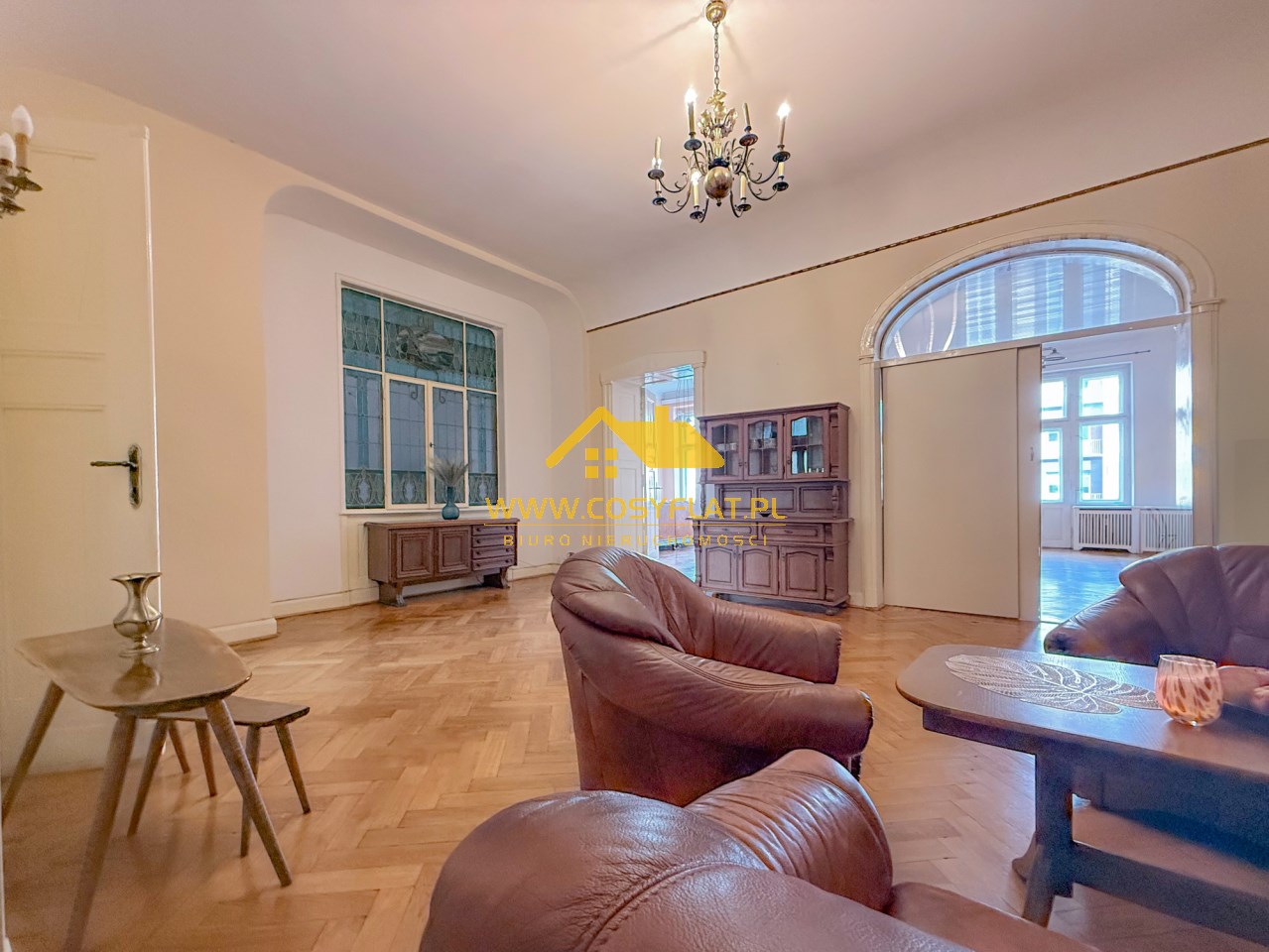 Prezentowana nieruchomość ma metraż 109 m2, na które składają się trzy pokoje -jeden z pięknym witrażem- wychodzącym na świetlik -oraz kominkiem. Kuchnię oraz łazienkę. Wysokość pomieszczeń to aż 340 cm.